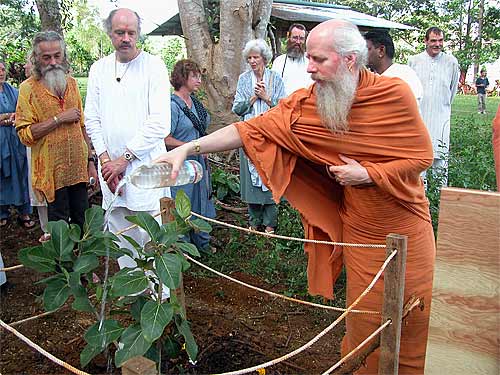 The devotees offer water to the new tree.