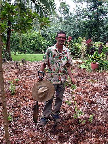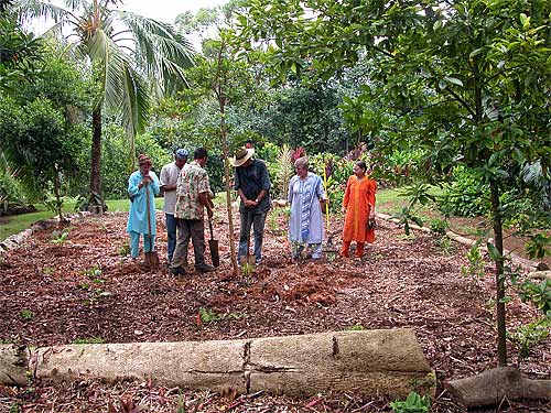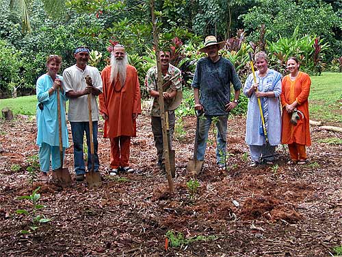 Mariah Martin (far left) also brought some Hawaiian species from the garden where she works, Waipa Gardens in Hanalei. Here is the planting team for our new garden. Left to right: Mariah, Tandu Sivanahan, Palaniswami, Kawika, deva Rajan, Gayatri Rajan and Asha Alahan. Vasuki, Darshani and 21-month-old Shaila Pushpa were on a break and so not in the photo.