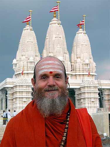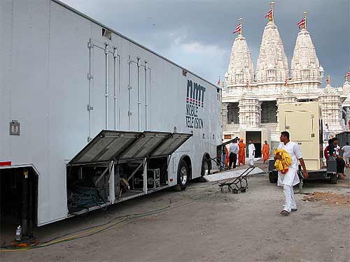 The murti pratishtha ceremony began, and we, along with most of the devotees, were watching it on the big screens. We think only the sponsors were able to fit in the temple itself. It's not a very big temple, maybe the size of Iraivan plus a little more width. After a while one of the sadhus walked up and asked Bodhinatha if he'd like to go to the temple and participate in the ceremony. Yes, of course, and we were on our way. Going out of the AC tent into the Texan mid-day height-of-the-summer felt just like being in India. We were escorted as VIPs to the temple, entering from the back, and up right in front of the shrines. Bodhinatha was seated on a comfortable chair right in front of the right-most shrine. I was on the floor next to him amongst many sadhus, cameramen and some very hot lights. It's amazing being around these swamis, because they interact with me just like I'm one of them. With Bodhinatha it's a little different; they show him great respect and treat him like the great guru that he is.