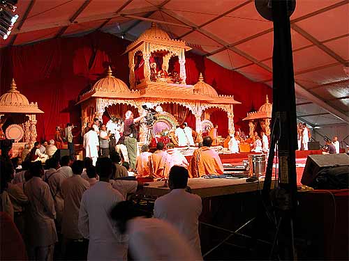 By the grace of Ganesha, Sadhu Jnanpurush Swami called to say our transportation for the day was coming. Our VIP vehicle made its way through traffic barriers, around security guards and through crowds of people, passing by rows of giant generators and temporary AC units with bundles of very large temporary ducting going out to the various tents and temporary buildings, around to the back of the big tent set up next to the temple where this mornings worship events were taking place. We were whisked inside the "Saints Only" entrance behind the stage, meeting lots of happy sadhus with beautiful smiles all along the way, and there we were up on the giant Swaminarayan stage. Pramukh Swami Maharaj, now 84, was in his grand chair, back to the audience, performing puja. I think the puja was for Sri Harikrishna (Radha-Krishna, who also appears on their altar and is explained as an earlier incarnation of God, Lord Swaminarayan being more recent and, of course, the founder of their sampradaya).