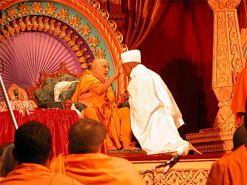 Five sadhus took Parshadi Diksha (white) and one sadhu took Bhagavati Diksha (orange) today in Houston. The ceremony is interesting. Each sadhu, accompanied by his father, went up on stage, already dressed in his new dhoti but bare-chested. Two senior swamis, Dr. Swami and the senior swami in charge of the Sarangpur training center, shared the duty of putting the shawl and hat on each new sadhu, and then one by one, accompanied by dad, they went up to Pramukh Swami for blessings. The father officially handed off his son to his second guru, Pramukh Swami gave his blessings in several ways such as touching him on the head, then looked him in the eye and spoke with him for a minute, apparently giving specific directions. The father then touched his son-now-sadhu's feet, stood together with him and Pramukh Swami for a photo, and turned around and left the stage. The emotion of the parents was noticeable and touching. Some may not know that the Swaminarayan Sanstha is very strict in that, after diksha, sadhus never again have any contact with their family. They are not even allowed to acknowledge them should eyes fall on each other by happenstance.