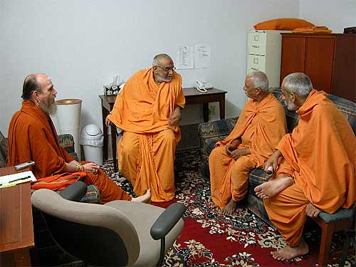 The beginning of our senior swami think tank in the house. This was a powerful meeting. Some major issues were discussed. These men are clearly Swamishree's inner circle, thinking about the major policies, the future of their order and congregation, of Hinduism in America and in the world.