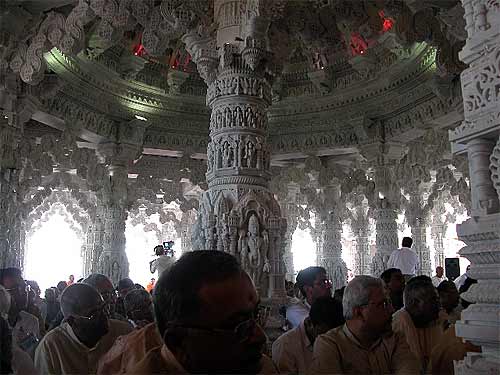 Not making our exit soon enough, we found ourselves quickly surrounded by devotees in one of those shoulder-to-shoulder mob scenes thought only possible in India. At first we just went with it, and we ended up in front of the main Swaminarayan shrine, where we noticed a powerful darshan and paid our respects accordingly. It was evident that we needed to begin pushing, as others were, so we squeezed our way through slowly and popped out of the crowd at the edge of the temple, where we ran into Dr. Mehta, who was delighted to see us at his new masterpiece of concrete engineering (he did their foundation with fly ash sans rebar, just like ours, which was the first). Soon after walking down from the temple to the ground level, we were met by some grihastha men who took us back to the main tent.