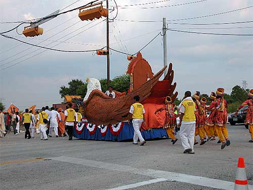 In the afternoon we got ready to go for the parade. The murtis went all around town in a grand parade for a few hours before the swamis and we joined at the local high school. When we got there, we were ushered into a very fancy new car to be part of the parade. There were hundreds of people in the parade, lots of kids dancing, chanting, singing, walking, etc. There were countless thousands of people on the roads watching the parade. We didn't get many photos from our position in the car in the parade itself, so we hope to get some from the pro photographers who were on the job. The floats were beautiful, the murtis are beautiful, it was great fun. More sadhus everywhere, very respectful of Bodhinatha, lots of love and a wonderful feeling of brotherhood in their eyes.
