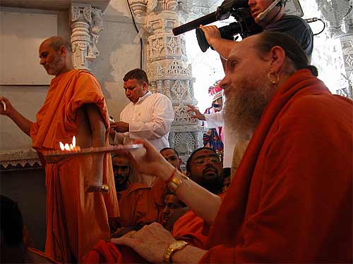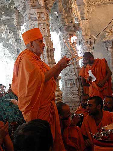 Swami Shree performs arati at one of the shrines of the new temple.