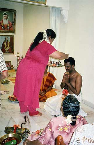 Sivaram's aunt applies kumkumam on his forehead.