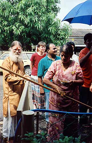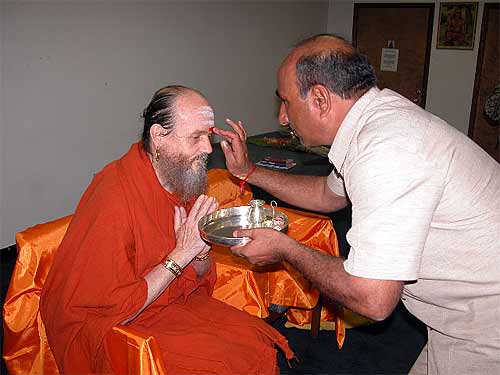 Bodhinatha then presented Swamishree with a Know Thy Self, a new Aum CD and a Dancing with Siva pocketbook, which Swamishree was very happy to receive. He asked his assistants to tell him exactly what they were, which was nice. Swamishree then gave instructions for some gifts to be presented to us, and moments later a nice orange bag full of prasadam (which we are bringing home), brochures, pictures of Swamishree and the temple, japa beads, etc. was presented to each of us. Shortly after that Jnanpurush Swami appeared with a sealed envelope of dakshina for each of us. The sadhus never touch money, so the cash had been prepared by the householder men, these worldly tasks for which there are always several men available nearby.