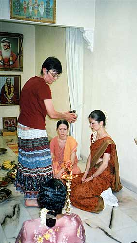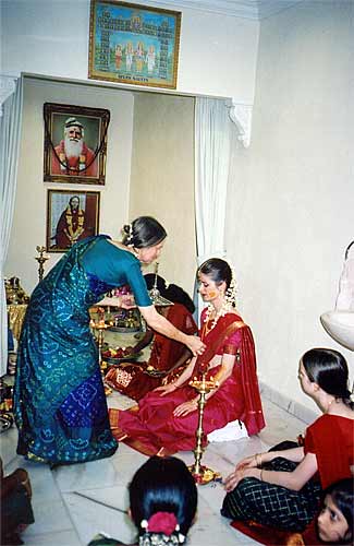 Devika's aunt doing the cleansing ceremony for her.