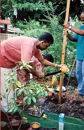 Sivaram breaks a coconut before the wooden stick to begin puja.
