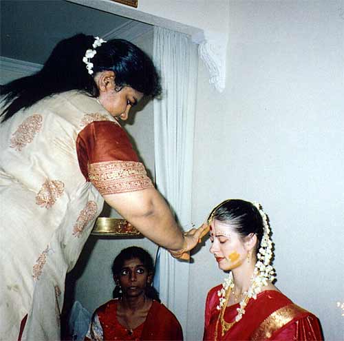 Sivaram's aunt applying kumkumam for Devika.