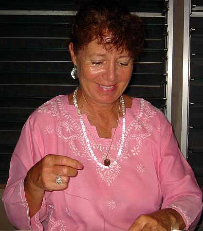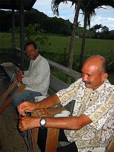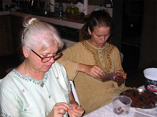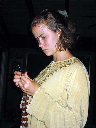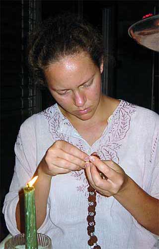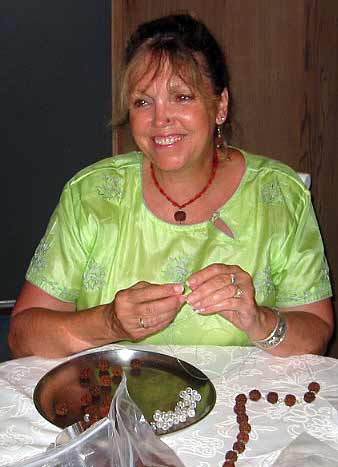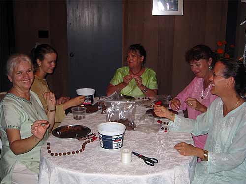 It's the All Wailua Mission Monday Family Home Evening at the home of Kulapati Durvasa and Kulamata Isani Alahan...Tonight the focus is the Rudraksha Iraivan Fund Raising Project. Here the ladies are do the final work of stringing and finishing the malas...