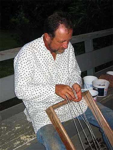 The men are drilling and then stringing the beads on wires...