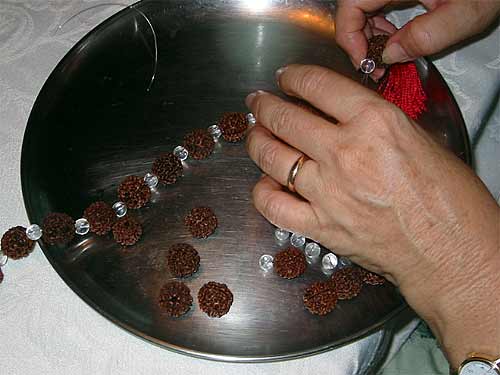 We take you now to our own Kauai, Wailua Saiva Siddhanta Church Mission where the sishya are working hard on their next fund raising goal: to make 100 Rudraksha Malas. The sales of these beautiful malas go to the Iraivan Building Fund. One Hundred malas at $60.00 each will be $6,000.00 for the temple!