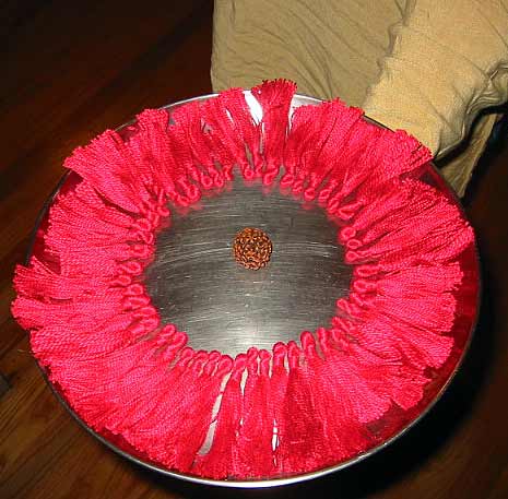 A tray of finished tassles, ready to be attached to "Guru" bead on each mala.