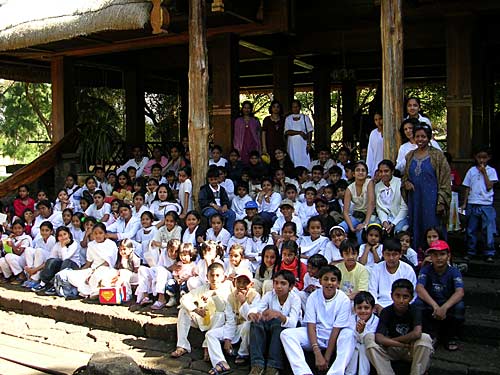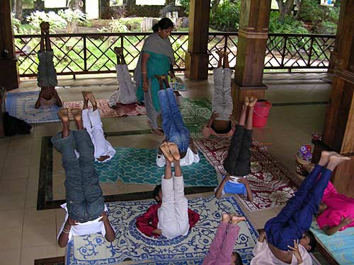 The Ganesha Homa is not only the busy activity going on at the Spiritual Park. On Saturdays classes in music and religion are organized for children there. Here is a group of children following the Saivite Hindu Religion class doing Hatha Yoga under the supervision of kulamata Premila Manick.