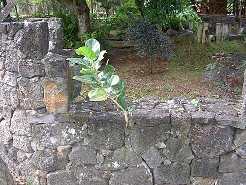 Here in Mauritius we do not have to make great efforts to get a banyan tree, ficus indicus, so sacred to God Siva. The birds, hovering like devas, bring them to you. Here is one growing on its own on the lava rocks wall separating the office buildings and the Ganesha Mandapam. We see a few more of these plants further ahead.