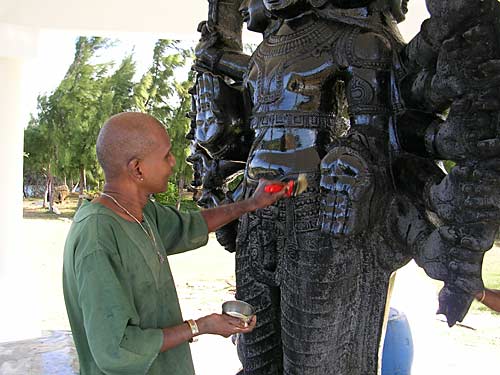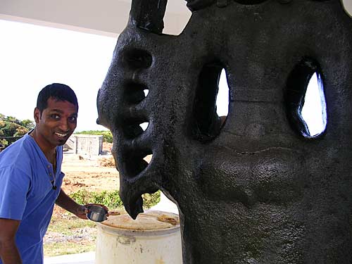 Now our karma yogis are doing their best to make the Muruga murthi look beautiful. They are applying oil on the black granite murthi
