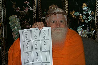 Gurudeva holds up a sheet with the 12 Mamsane which are basic meditations outlined in the Shum language that are used, one for each month of the year. These are carved into the pillars of Iraivan, providing pilgrims meditations whenever they come. Here is one example: