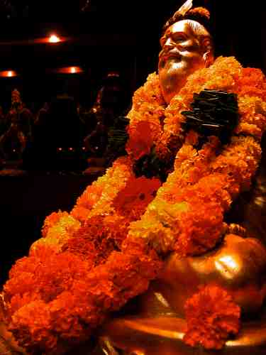 Gurudeva covered with marigolds, grown by our Siddhidata Kulam and lovingly put into garlands by one of the monks on vigil.