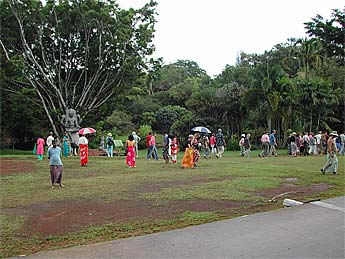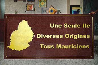 When devotee Manon Mardemootoo visited Kauai a couple of years back and saw these 3-foot by 6-foot rose granite signs, he thought how wonderful it would be to make a similar gift to his nation-island of Mauritius. Bodhinatha responded by having six signs made in Bangalore, of which this is the first. In French it says, "One Island, Many Peoples, All Mauritians" and like the Kauai signs it is meant to promote and strengthen unity in diversity in this nation which is mostly Hindu.