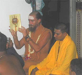 Saravananathaswami shows the booklet that has been specially prepared for the Shishya's who has taken their first Diksha