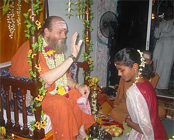 We have two new sadhaka taking vows today. They have been sitting by our wall very sincerely, Nilakantha and Jivananda. They will become Saiva sadhaka and the devas at the walls have blessed them. Another group of sadhaka and yogis are renewing their two-year vows today also. The vows are given for two years. They can be renewed or not renewed. It is up to the individual or to the entire group of us.