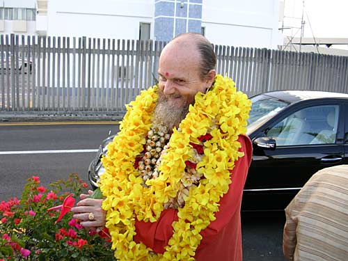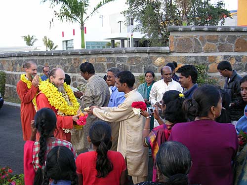 Bodhinatha is just arriving from the VIP lounge. When alighting from the car His Holiness is garlanded by Kulapaties Koothan and Valaytan.... Welcome to Mauritius Beloved Bodhinatha! Everyone then comes forward to offer flowers and welcome Bodhinatha and swami. The sishyas are so happy to be in the midst of their Guru...