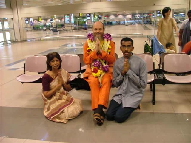 Our beloved Satguru arrived in Singapore on 13 September 2004 at about 1 pm. As always, there was tremendous excitement in the air as everyone eagerly awaited Bodhinatha's arrival. At the airport Bodhinatha is discussing some details of the day's program