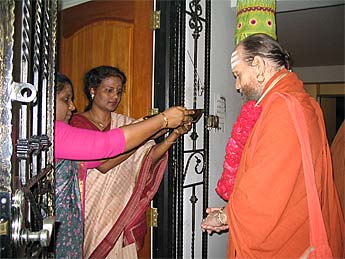 After getting settled and a short rest at the hotel, in the evening Bodhinatha arrives at Kulapathi Dohadeva's home which is our mission home. Kulamata Nagavathy and Mrs Bhani perform the arati for Bodhinatha.