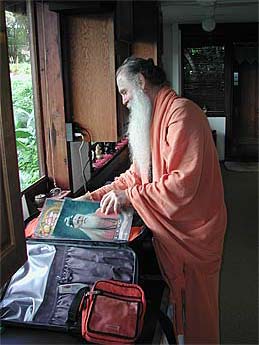 The Ganesha at the new temple in Arizona had been gifted by Gurudeva years ago and the devotees there feel very close to the Aadheenam. They extended and invitation to Bodhinatha, but since he was in Asia, Paramacharya Palaniswami is going in his stead to represent the Aadheenam. Here he is getting together some gifts for the temple.