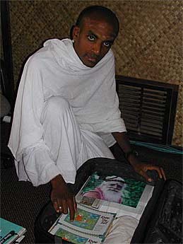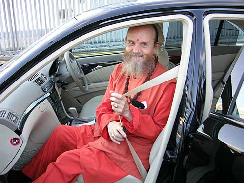 After having said a few words to the group, Bodhinatha gets into the car to go to Trou aux Biches in the northern coastal region. It is about an hour drive from the airport.