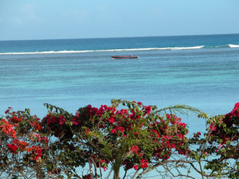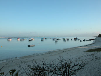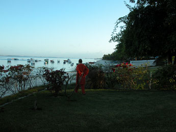 Early morning scene outside the bungalow. Because there is a reef some ways out, the water close by is very calm and clear.