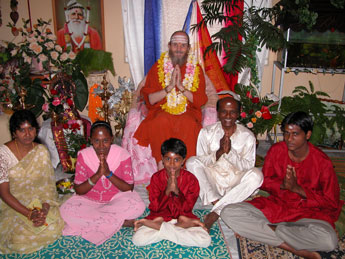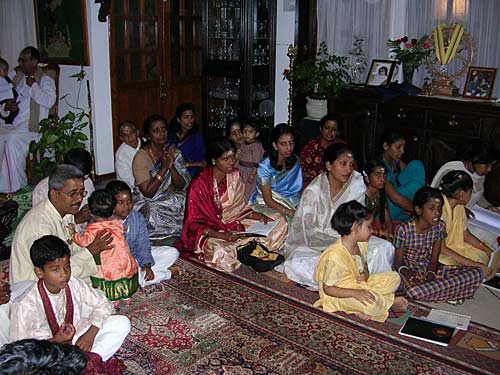 Bodhinatha is meeting Church members of the different regions of the island on different days. The members living in the north, mainly from the Mardemootoo and Manick kutumbas all met at the residence of Kulapati Manon for a satsang with the Guru last night, Friday evening. Here Kulapati Manon is doing the puja assisted by Brahmachari Vel Mahalingum.
