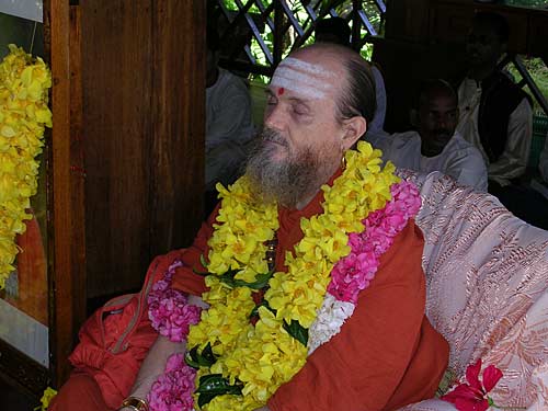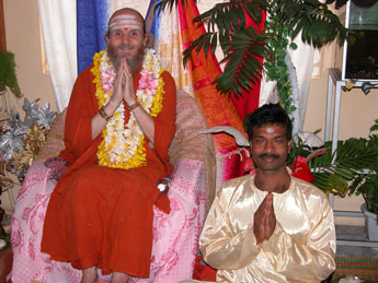 Bodhinatha in meditation while the spiritual vibration is building up...After the chanting and burning of notes to the devas, four sishyas were called forward to receive their samaya diksha.