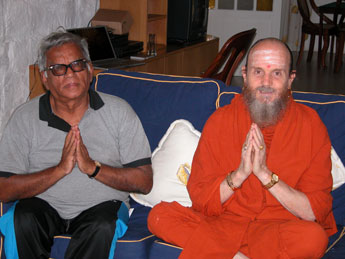 More meetings at the bungalow. This is Dr. Pillay who publishes a newspaper called Vanakkam and regularly includes HPI articles and lessons from Gurudeva's Master Course trilogy. He really admires Gurudeva's writings and is very eager for our help to educate Hindus so they become strong enough to withstand enticements to convert to Christianity and other religions