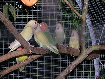 Paramacharya Ceyonswami has been coordinating the new cage made from a garden gazebo frame... These young Love Birds are stunning in their varied colors (which can't clearly be seen here) and very sweet and tame.