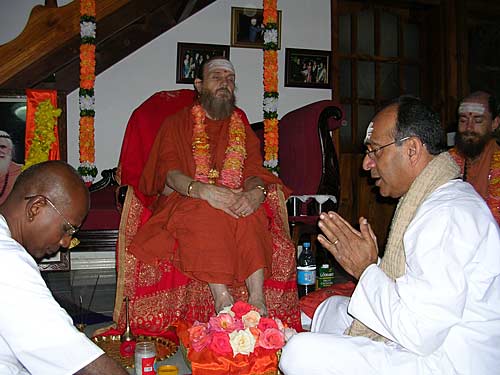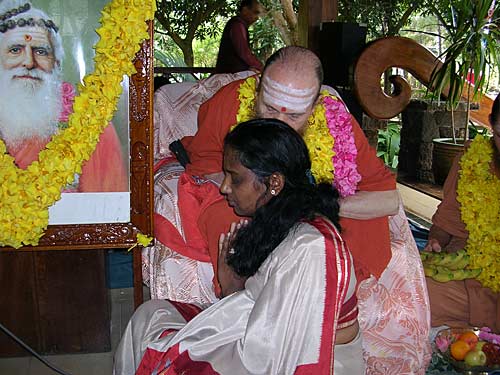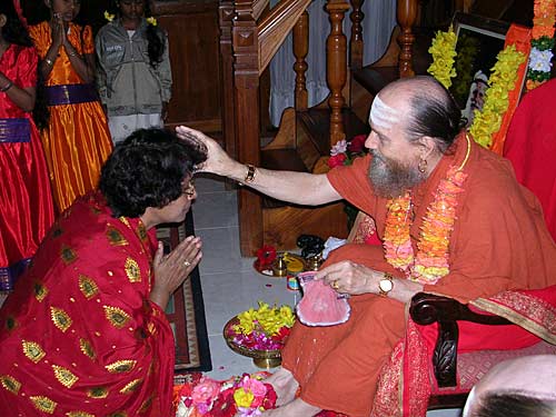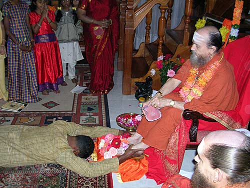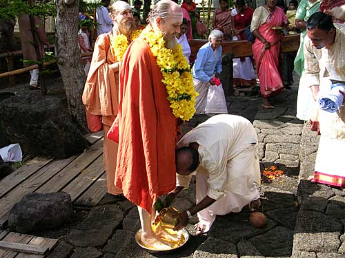 Kulapati Amba Valayten traditionally washes the Feet of the Guru at the lava rock steps of the Mandapam.