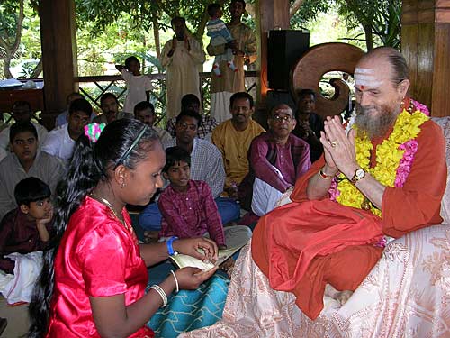 After the talk Bodhinatha certificates of completion for the Saivite Hindu Religion Book Two were awarded by Bodhinatha to many students, mostly children who are currently following Saivite Hindu Religion seminars every week at the Spiritual Park. Here is Ulasha receiving her certificate with a rudraksha bead from Bodhinatha.