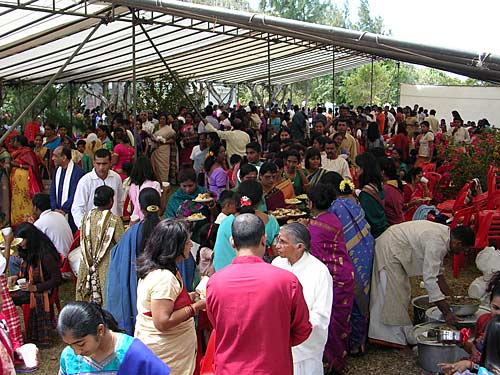 Here devotees are lined up near the Mini Mela waiting to have their books signed by Bodhinatha. Visitors were able to buy their books inside the Mini Mela as well as at a special stall set outside by Selvaraj Sanjeevee.