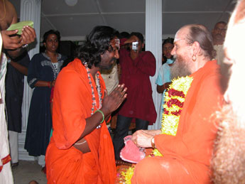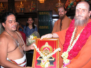 We have another set of photos that were taken by Saravananathaswami from the day of initiations at the Pudu Pillaiyar temple in Malaysia... Here the priest of the temple presenting Bodhinatha with a picture of the Deity of the temple.