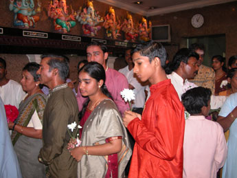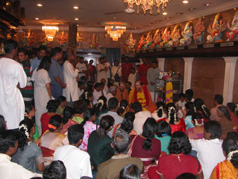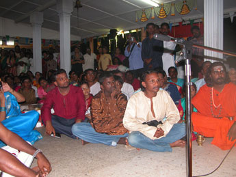 Now we are at the Kotu Malai Pillaiyar Temple in Pudo district, downtown Kuala Lumpur where Bodhinatha is about to bestow samaya diksha, or mantra diksha, on four Saiva Siddhanta Church sishyas. This diksha is the initiation into daily chanting of the Namasivaya mantra. A crowd is packed tightly around, watching the proceedings intently.