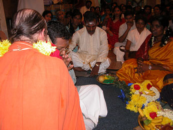 Newlywed couple Sivanathan and Puvana Batumalai reading their comprehensive marriage vows to Bodhinatha.