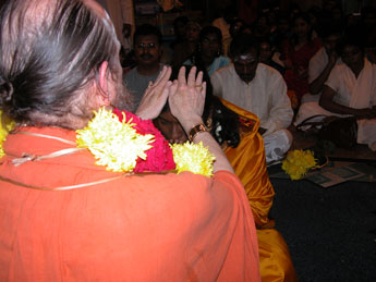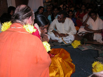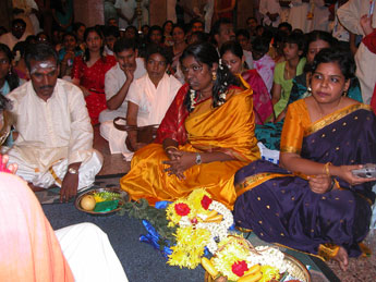 Next diksha recipients eagerly awaiting their turn--Annapoorani Ganesan on far right, and Sarkunavathy Sockanathan second from right.