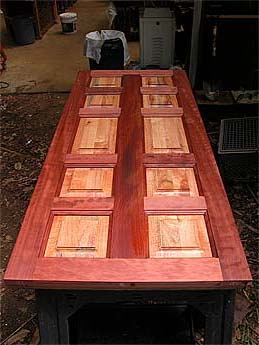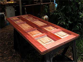 Our very well appointed carpentry shop put together with the kind donations of a benefactor and built up by Acharya Kumarswami, can turn out some very beautiful things. Here are new doors for a recently renovated monastic facility.