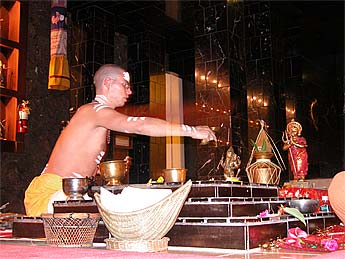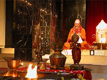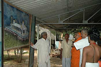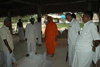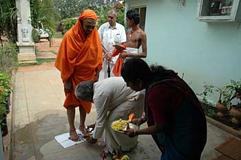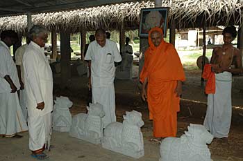 From Bangalore, we have a series of photos from the visit of His Holiness, Jayendra Puri Swami, the ordained successor to H.H.Tiruchy Mahaswamigal of Sri Kailash Ashram, Bangalore visited our Iraivan worksite at Bangalore on 20th September 2004. Jiva Rajasankara washes his feet and Kanmani does the traditional arati....