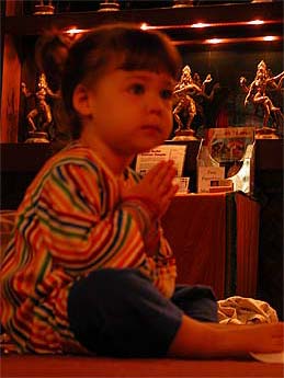 Putrika Shaila Pushpa Sendan will be 2 years old in just a few days (October 5th). She has been coming to the Sun One homas nearly every week even before she was born. Here she holds her hands in anjali mudra while the arati is passed during the homa.