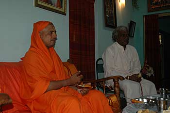 Swamiji is having tea with some snacks at the residence of Jiva Rajasankara