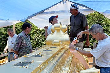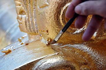 Here she found a small ungilded area, she paints it with sizing.