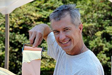 Here is William showing us what is called the gilders' roller. It actually has two rollers, one is for a roll of goldleaf on paper backing and the second looks like small painting roller.