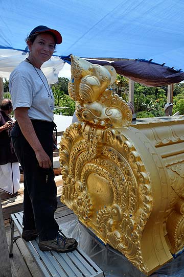 Jill is monitoring "touch up" where inevitably small spots are not covered with gold. She will find each of these, and paint a fresh coat of sizing on them and mark them with small tags of blue tape